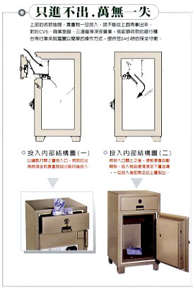 鎖 具:採用高安全性轉盤密碼鎖, 可任意變換百萬組密碼,並附轉盤鎖定裝置。